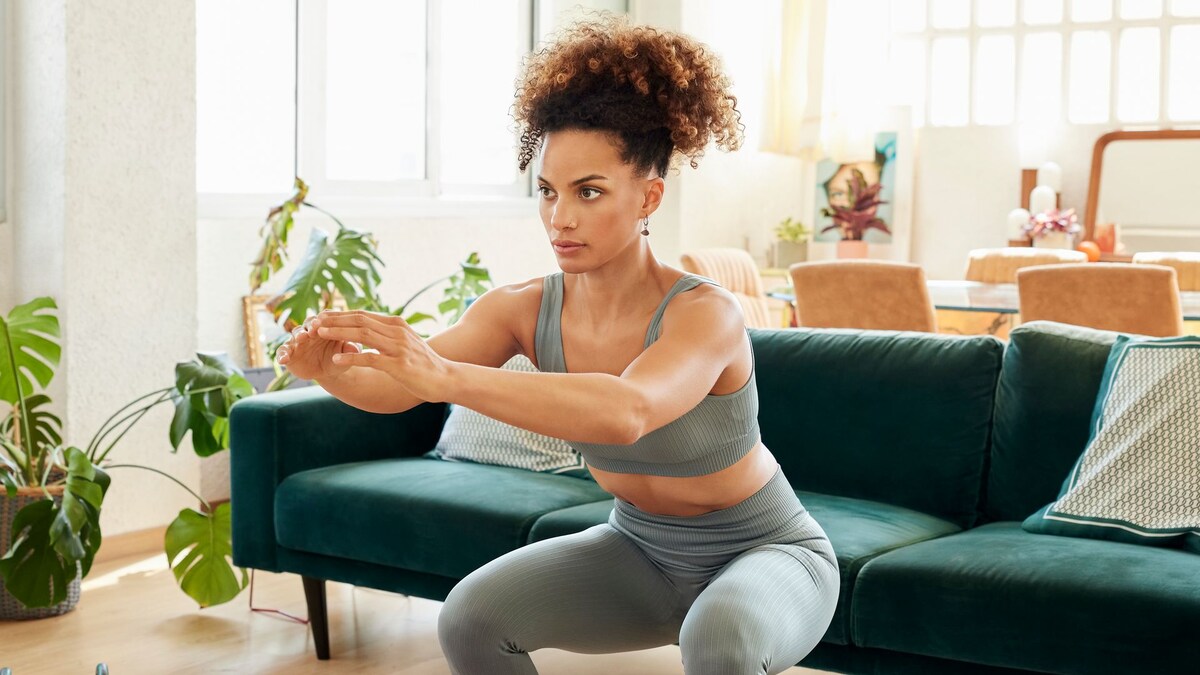 Mantenga esta posición durante un segundo para aumentar la intensidad, luego levántese nuevamente, manteniendo los glúteos y las piernas comprometidos durante todo el movimiento. También puedes modificarlo y hacer sentadillas con salto si tienes las rodillas sanas.