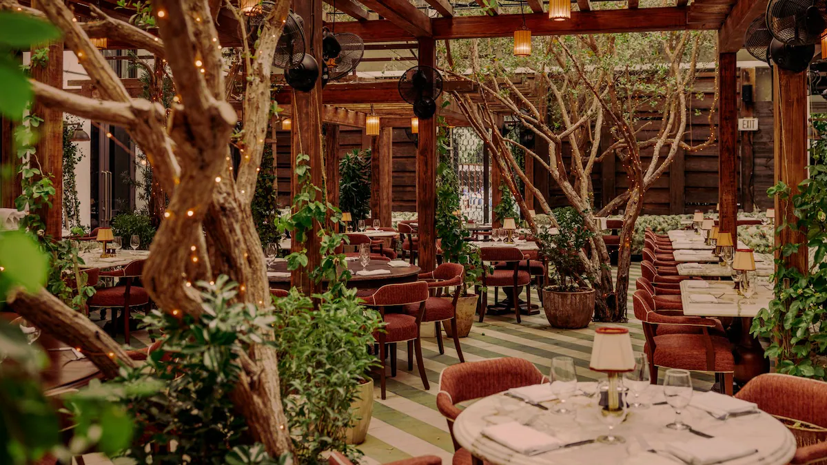 Dentro de Soho Beach House, La playa de Miami de Cecconi Ofrece cenas al aire libre, iluminación tenue y un ambiente costero relajado. Los patios bordeados de olivos preparan el escenario para una velada íntima repleta de cocina italiana clásica.