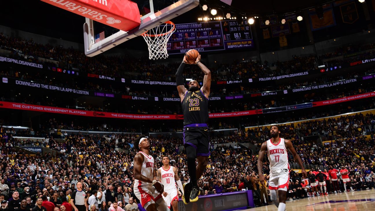 LeBron James convirtió 28 puntos y lideró a Lakers de Los Ángeles es su triunfo por 101-94 sobre Cohetes de Houstonque los pone 2-0 en la serie, pese al regreso de Kevin Durant al quinteto de Ime Udoka.