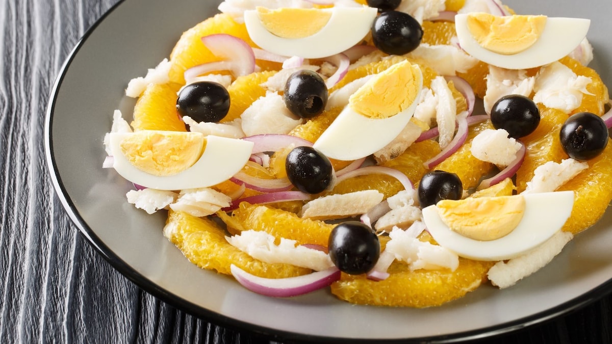 5. Ensamblar la ensalada: En un tazón grande o plato para servir, combine el bacalao, las piezas de naranja, la cebolla, los huevos y las aceitunas negras.