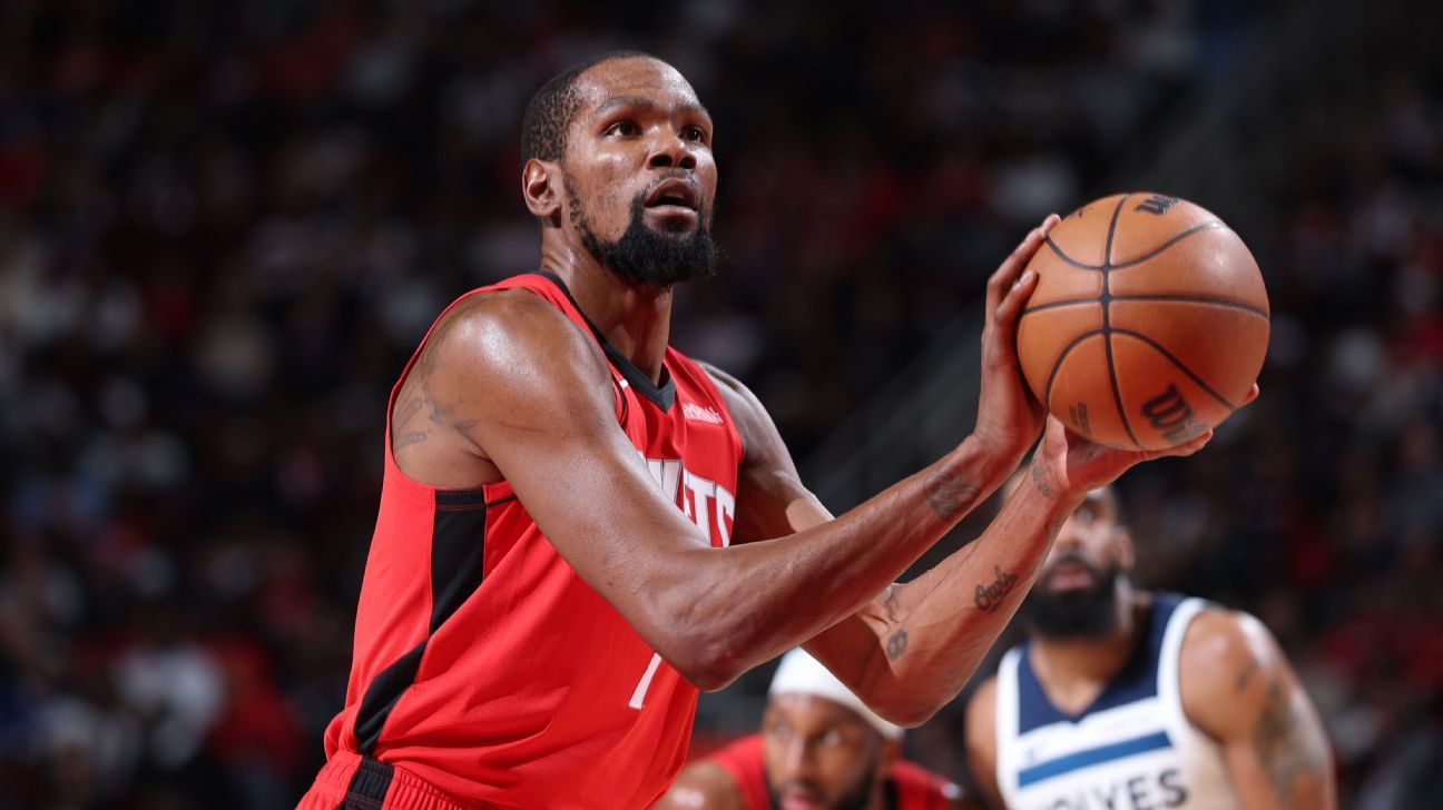 Kevin Durant etiquetado 39 puntos para guiar a Cohetes de Houston a la victoria sobre lobos de minnesota este viernes, Caballeros de Cleveland sumó su segundo triunfo en 48 horas en Philadelphia y Clippers de Los Ángeles se metieron en puestos de playoffs tras vencer a Raptores de Toronto.